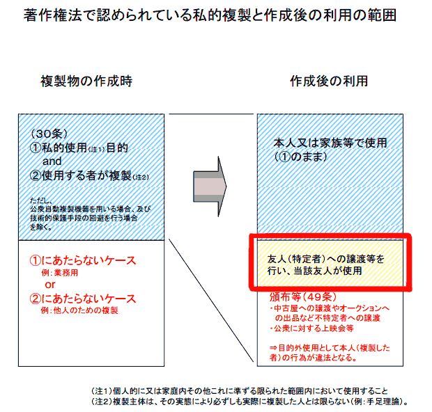 著作権法で認められている「私的復製と作成後の利用の範囲」は以下です